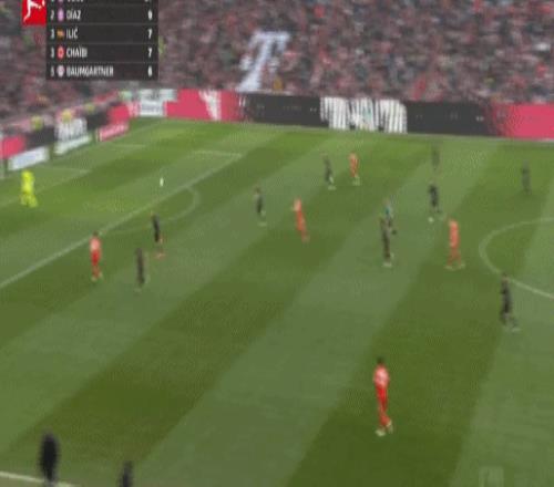 第29分钟,拜仁前场4打3,迪亚斯把球停大了,随后被达门化解