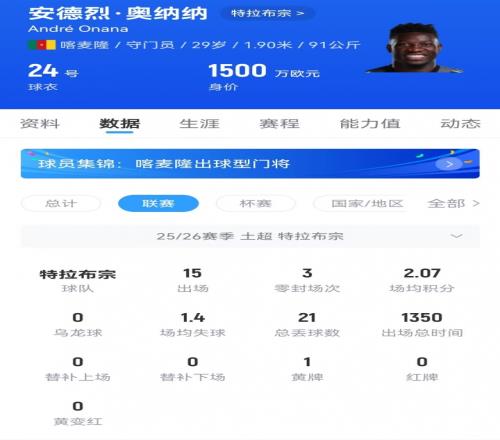 据显示,奥纳纳租借期限为一年,球员基础薪资351万美元,签字费175.5万美元。根据此前多家媒体的报道,算上签字费、奖金和较为优惠的税率,奥纳纳在特拉布宗的收入比起曼联时期接近翻了一番。