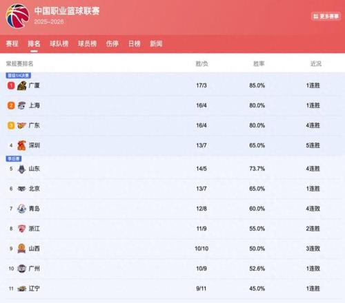 首先排在前五的队分别是广厦、上海、广东、深圳以及山东队。从这样的排名我们可以看到,此前曾经排在榜首的广东队,这一次再度是掉落到第三。因为广厦队在最近一场比赛中拿到了胜利,目前他们以85%的胜率排在第一名。而上海以及广东都是80%的胜率,所以这也就意味着广东男篮在今天晚上对阵吉林队的这场比赛变得非常的关键。