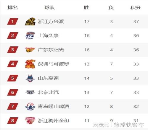 积分榜第5名则是山东队,这一轮比赛他们在主场以24分大胜宁波队,收获一波4连胜,成功将战绩提升到14胜5负,尽管球队还少赛一轮,不过,山东队还是排在积分榜第五名。而第6名则是北京队,他们的战绩为13胜7负。排在第7名的是青岛队,这一轮比赛他们输球之后,球队的战绩变成12胜8负,目前,青岛队已经遭遇4连败,球队排名也从当初的前四名,下滑到积分榜第7。积分榜第8名则是浙江队,他们的战绩为11胜9负。