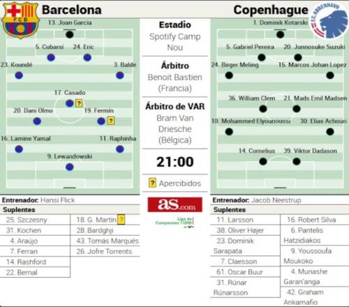 以下是巴萨对阵哥本哈根的可能首发阵容预测。巴萨预计首发阵容(对阵哥本哈根):