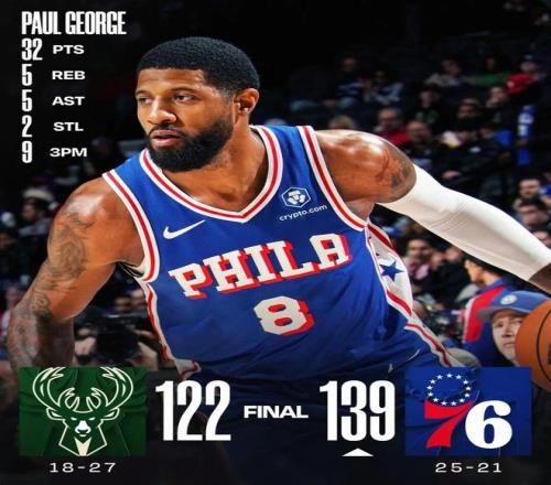 在本场之前,乔治本赛季一共为76人打了25场比赛,场均上场30.2分钟,只能得到15.4分5.3篮板3.6助攻,三项命中率41.5%/36.4%/86.5%,真实命中率54.8%。