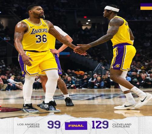 末节决战,亨特抛投命中,詹姆斯崴脚后4罚3中。亨特跳投取分,米切尔抢断詹姆斯后完成暴扣。詹姆斯远投打铁,随后上篮被汤普林封盖,米切尔4罚全中,湖人换上布朗尼等替补席末端的球员,雷迪克选择提前弃子认负。亨特上篮打进,骑士打出了12比3的攻势将分差扩大至31分。两队随后在场上练兵,比赛时间逐渐走完。最终,骑士以129比99完胜湖人得以斩获5连胜,紫金军团的2连胜就此被终结。