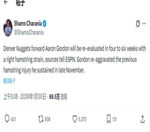 北京时间1月30日上午,据NBA名记Shams报道,掘金前锋阿隆-戈登遭遇右腿筋拉伤,将在4到6周后接受重新评估。本赛季之初,戈登也曾遭遇右腿筋拉伤,当时他连续缺席了19场比赛。1月5日戈登复出,打了10场比赛伤势复发。