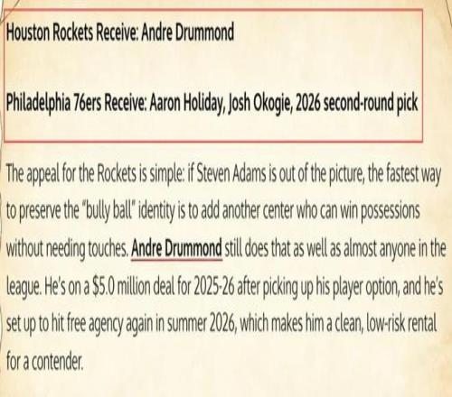 美媒《Fadeaway World》撰文建议,火箭可以将霍勒迪、奥科吉以及2026年的次轮签送到76人,换回这位昔日全明星中锋。