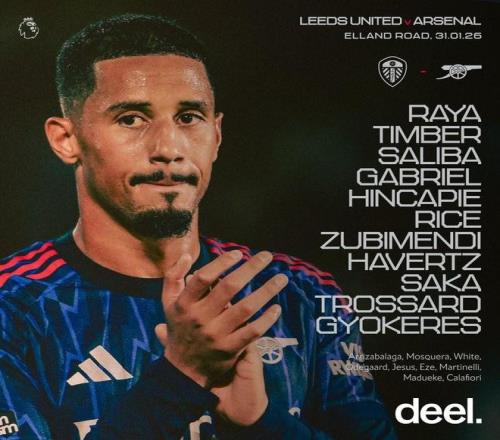 利兹联vs阿森纳:哲凯赖什、哈弗茨首发,特罗萨德、萨卡出战