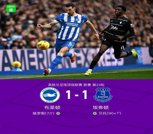 北京时间1月31日英格兰足球顶级联赛 联赛 第24轮,布莱顿主场对阵埃弗顿。布莱顿格罗斯破门。埃弗顿贝托破门。最终比分布莱顿 1-1 埃弗顿。