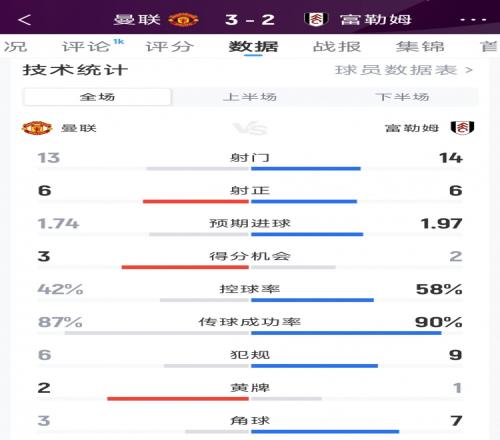 精彩刺激!曼联32富勒姆全场数据:射门1314,射正66